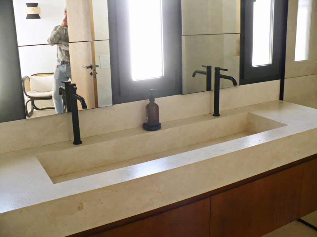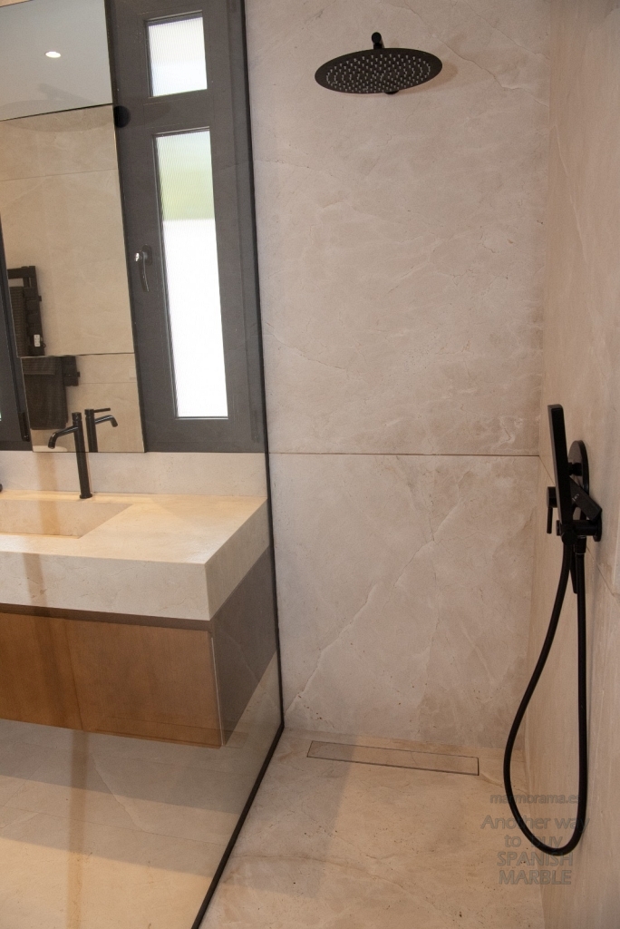 For the bathroom wall cladding the combinations are different for enhancing the incoming light: Showers are made in a large cut to size piece of Crema Marfil leather but opposite wall is made in Crema Marfil only sandblasted, that catches the clarity with its whitish surface.