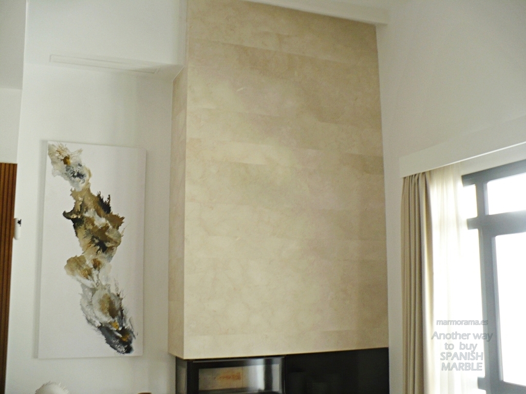 The fireplace dressed with marble Crema Marfil follows this idea, with a current design shown in its straight lines and large width but embracing a space for the fire that remains the old cooking kitchens of our ancestors.