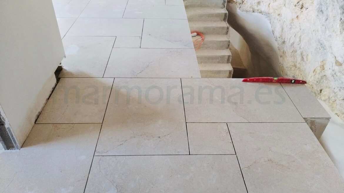Crema Marfil marble tiles in size 90×60 for a project in Mallorca islands. The finish is bushammered & brushed, that provides a rough surface but softer to the touch. This stone is very used for outdoor paving in villas, over all when intended to match the Crema Marfil used indoor with the exterior flooring.