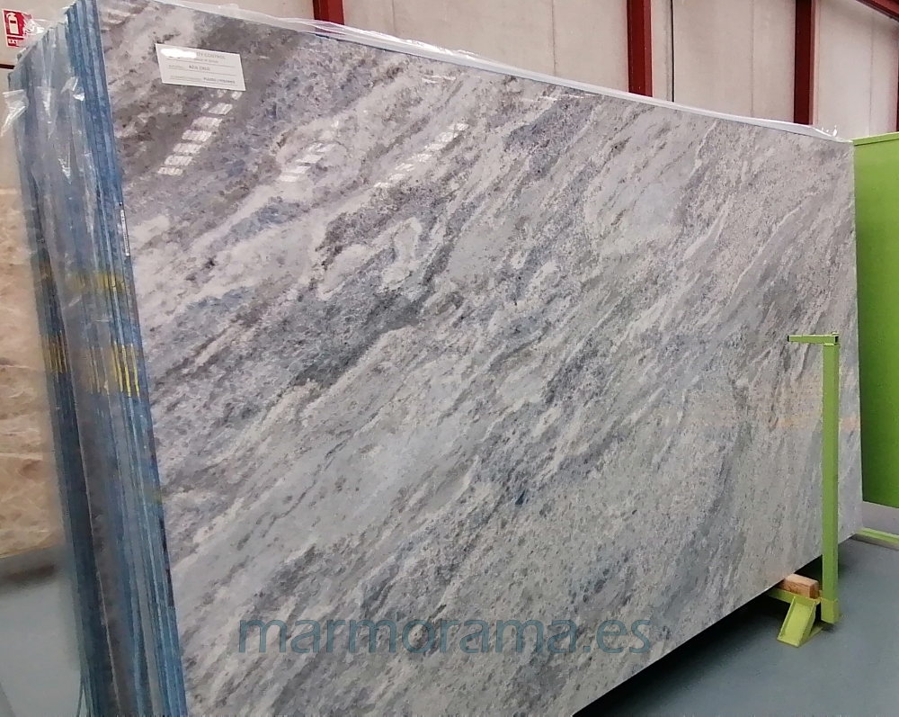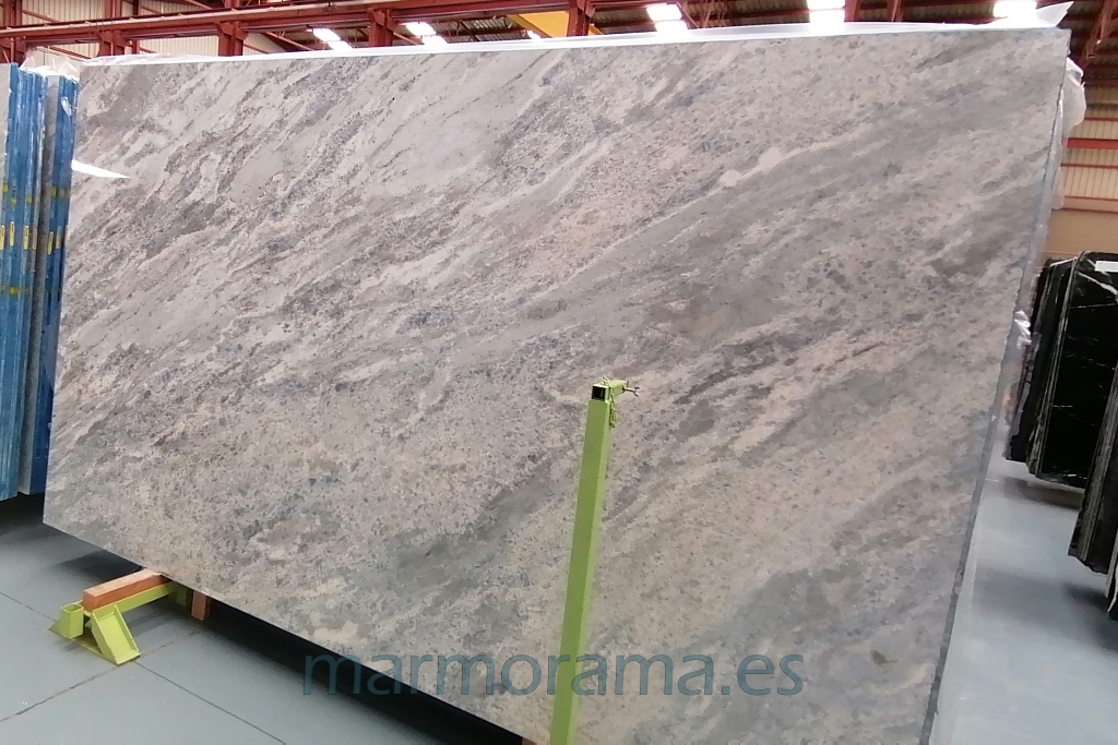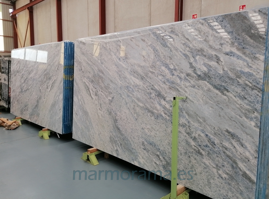 Azul Cielo Quartzite is in reality a hard marble, an exotic natural stone from Brazil known for its unique and rare light blue and grey hues, with a big crystal grain composition that reflects the light in luminous sparkles.