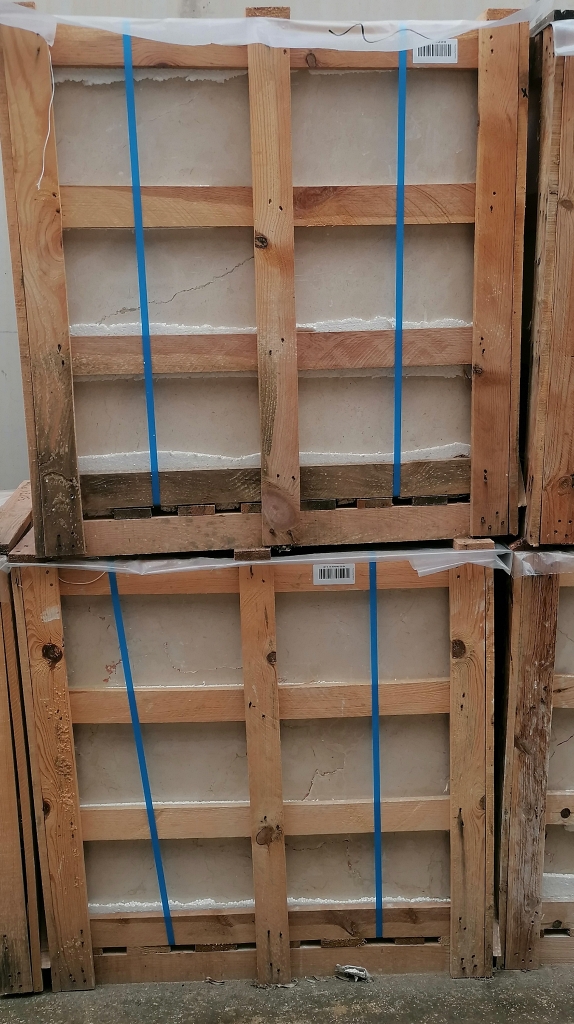 Crema Marfil marble tiles in size 80x80x2 cm. The finish is polished and are classified as Medium range: Some marked veining, some holes covered with mastic, mesh on the back.