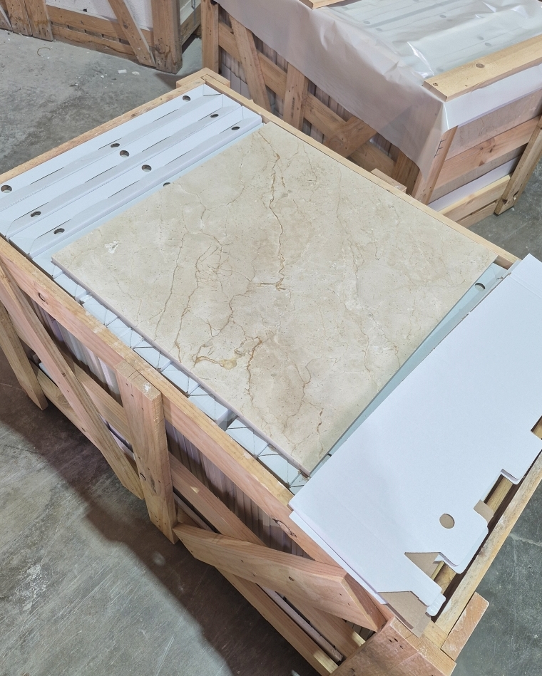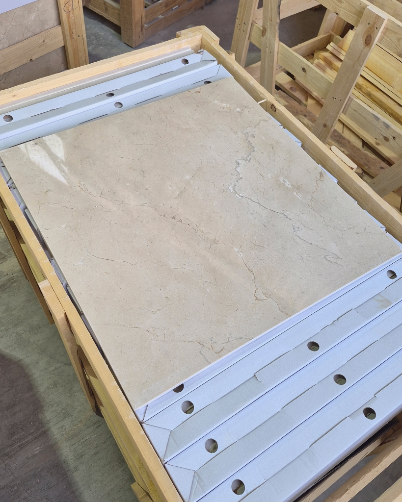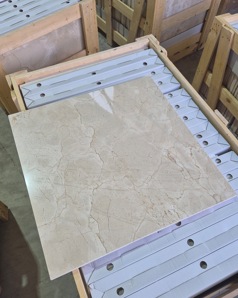 Tiles 60×60 marble Crema Marfil in 1,5 cm thick, polished. Range Commercial, more veining or some big vein or change in the background tone of color.