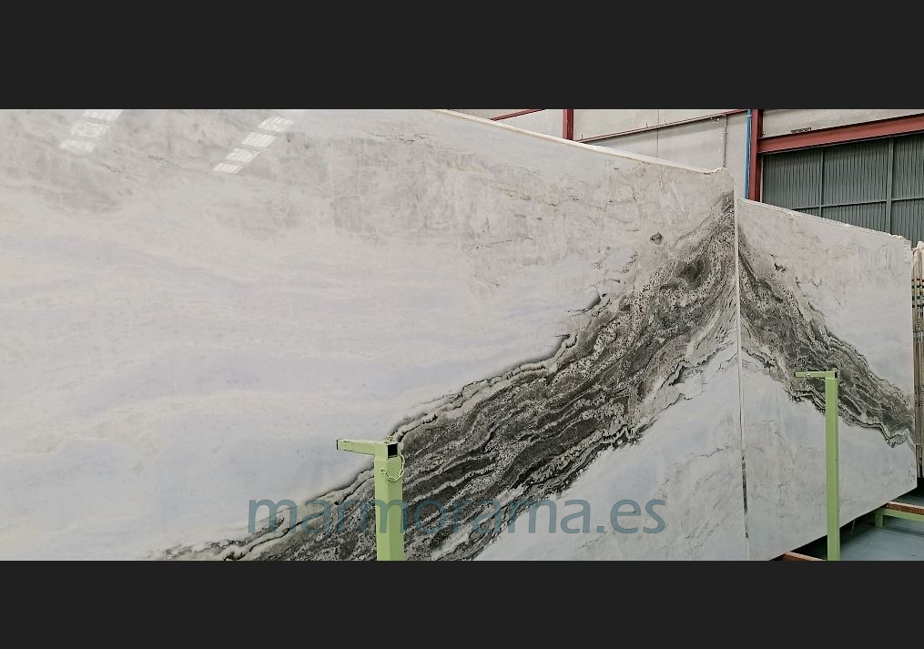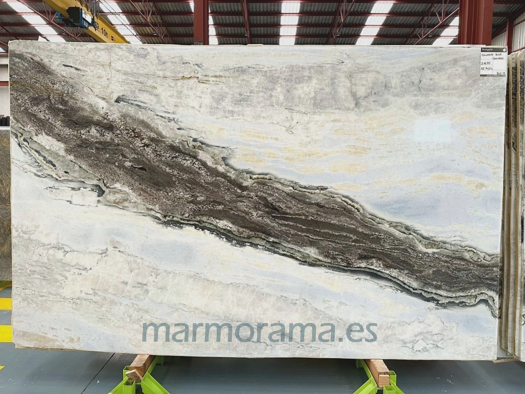 Dalmata Blue quartzite (it is in real a marble) features a soft white background mottled with a sky blue watercolor crossed with a smooth smoked grey hues big vein.