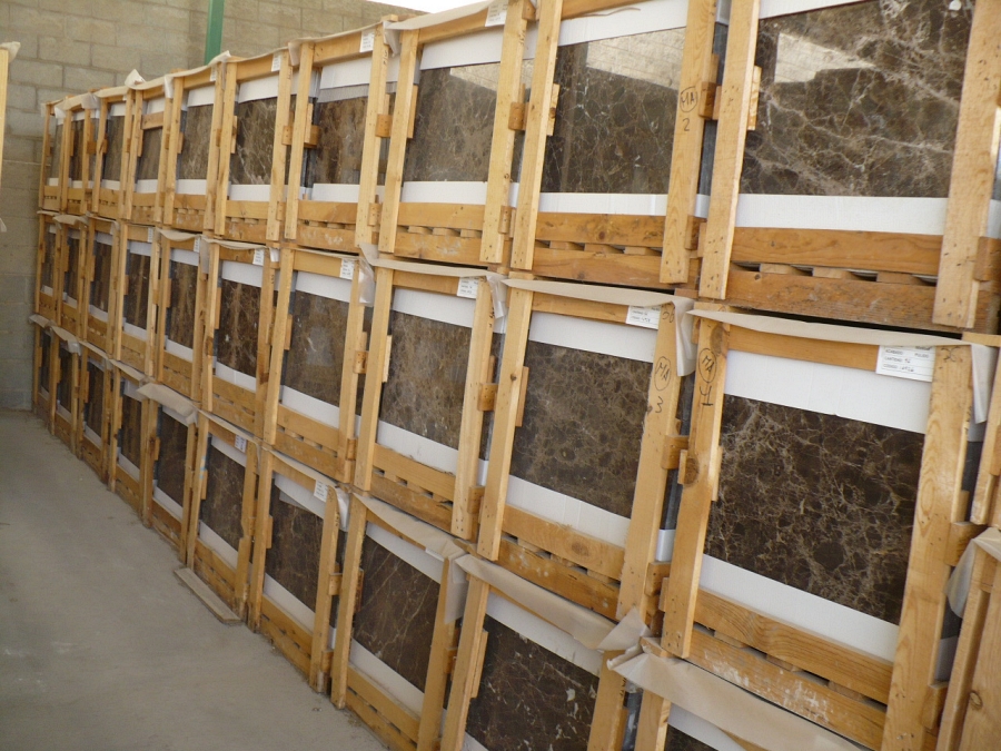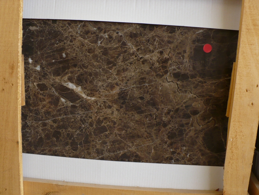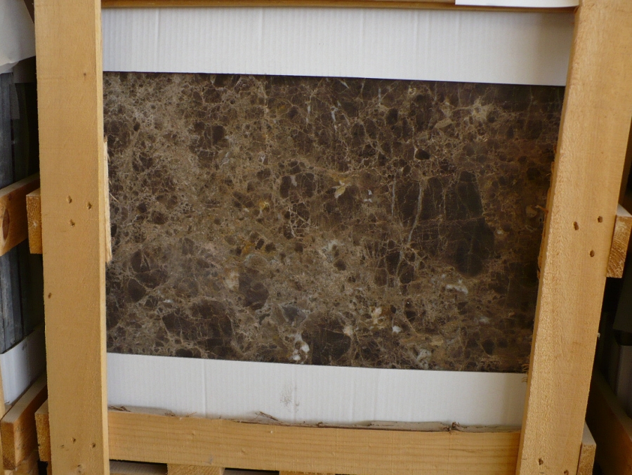 Dark Emperador marble tiles 60x60x1,5 cm (24×24″) polished. High Range, Dark brown background with spider veining. No mesh on the back as it is reinforced with epoxi on the face. No bevel. Suitable for underfloor heating areas. Quantity available: +/-600 m2.