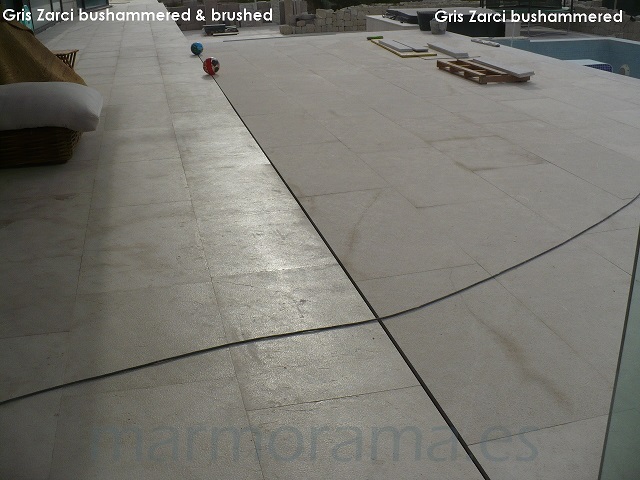 Gris Zarci (Crema Levante) stone tiles in small sizes (30×30, 40×30, 60×20…) in finish bushammered, that provides a rough surface. This offer allows to take natural stone for exterior paving or wall cladding at an unbeatable price. Very useful for walkways or swimming pool surrounds.