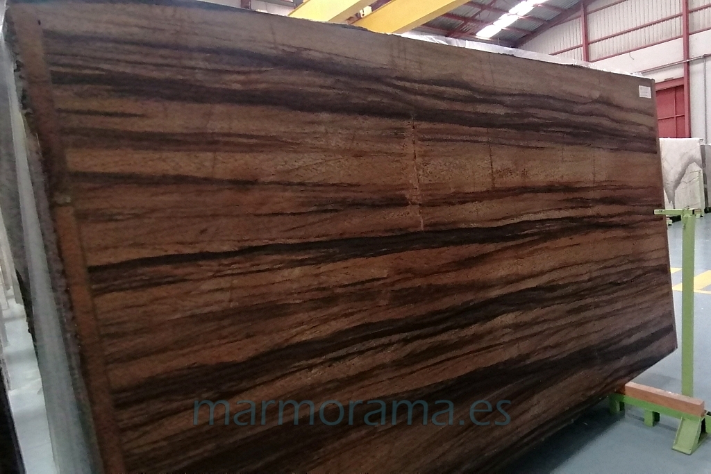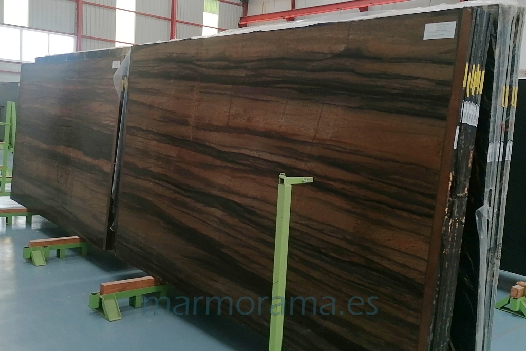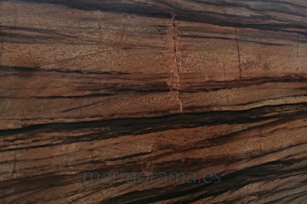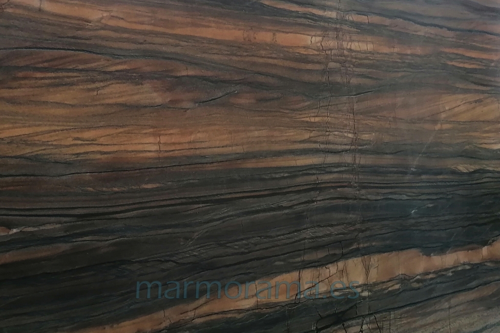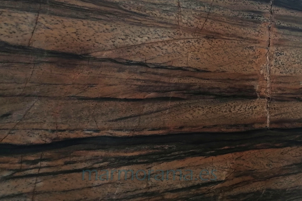 Sandalus Brown Quartzite combines deep browns and charcoal black in a striate, wavy pattern, resembling natural wood petrified edge grains. Leather finish enhances this aged appearance.