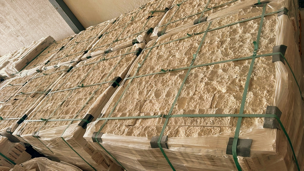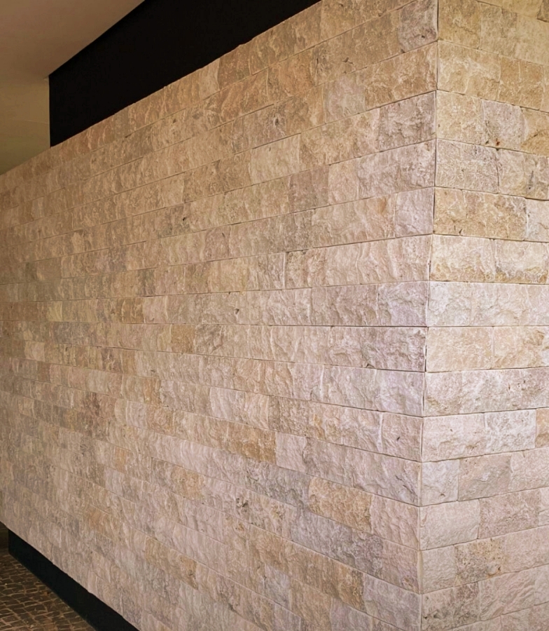 Travertine tiles in split finish dimensions 10 cm height x free length x 3 cm. A travertine split finish creates a highly textured rustic look by breaking the stone’s face with a guillotine, providing a 3-D pattern and a rough surface.