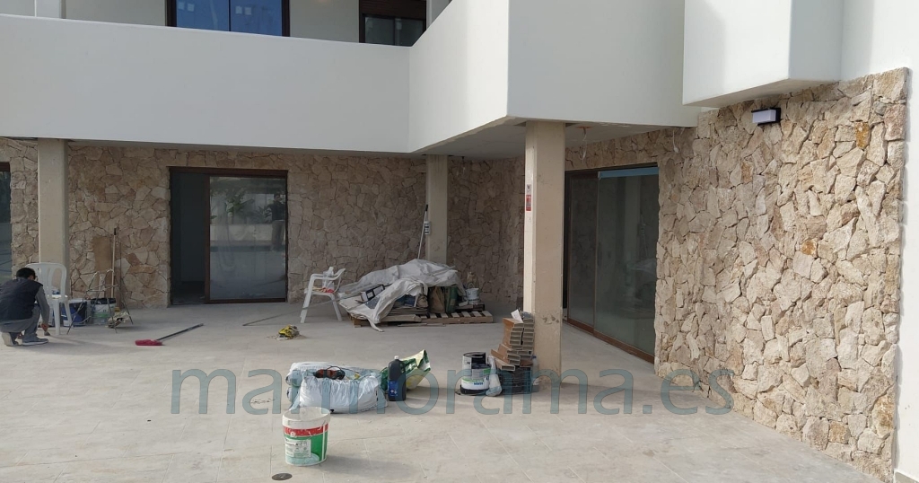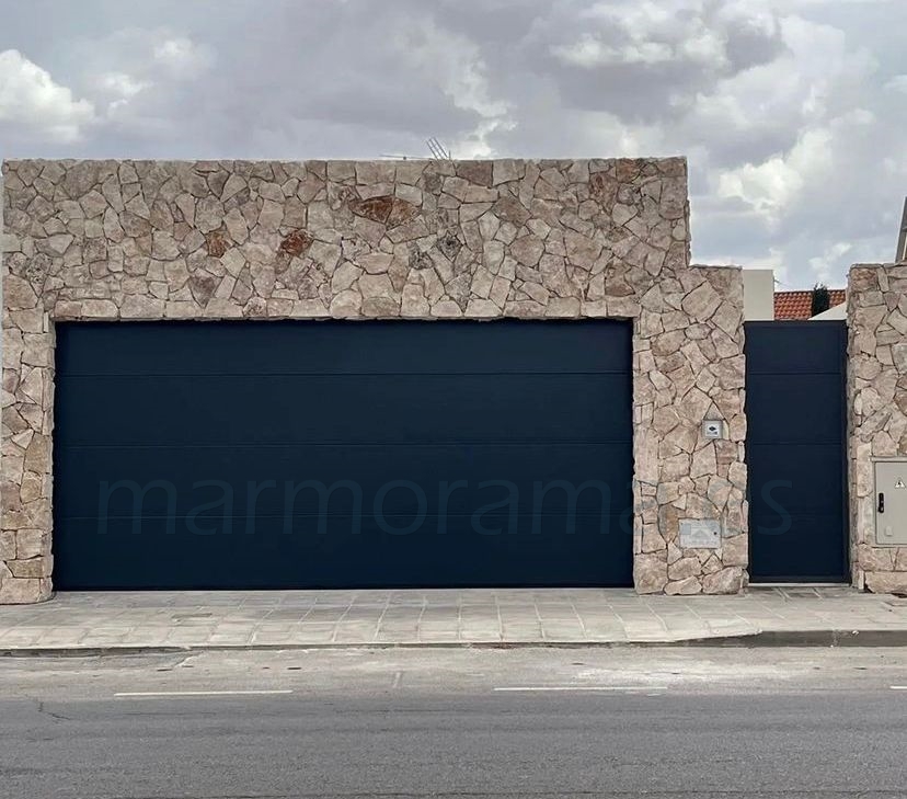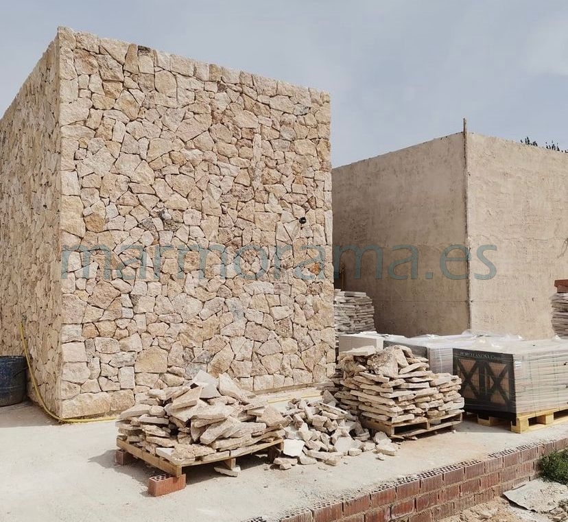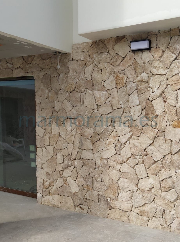 Travertine cladding stone with random irregular shapes for wall cladding. Face are rough (split) and sides –from 20 to 35 cm) irregular (it is the mason who tailors piece by piece or puts separately with grout). Thickness between 3,5-4 cm and back is sawn, for a perfect installation.