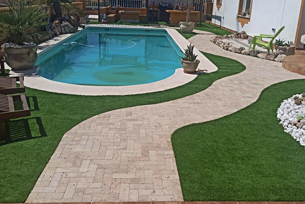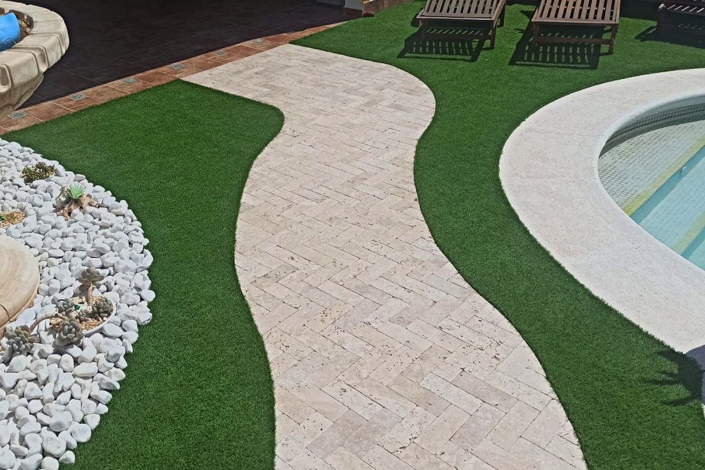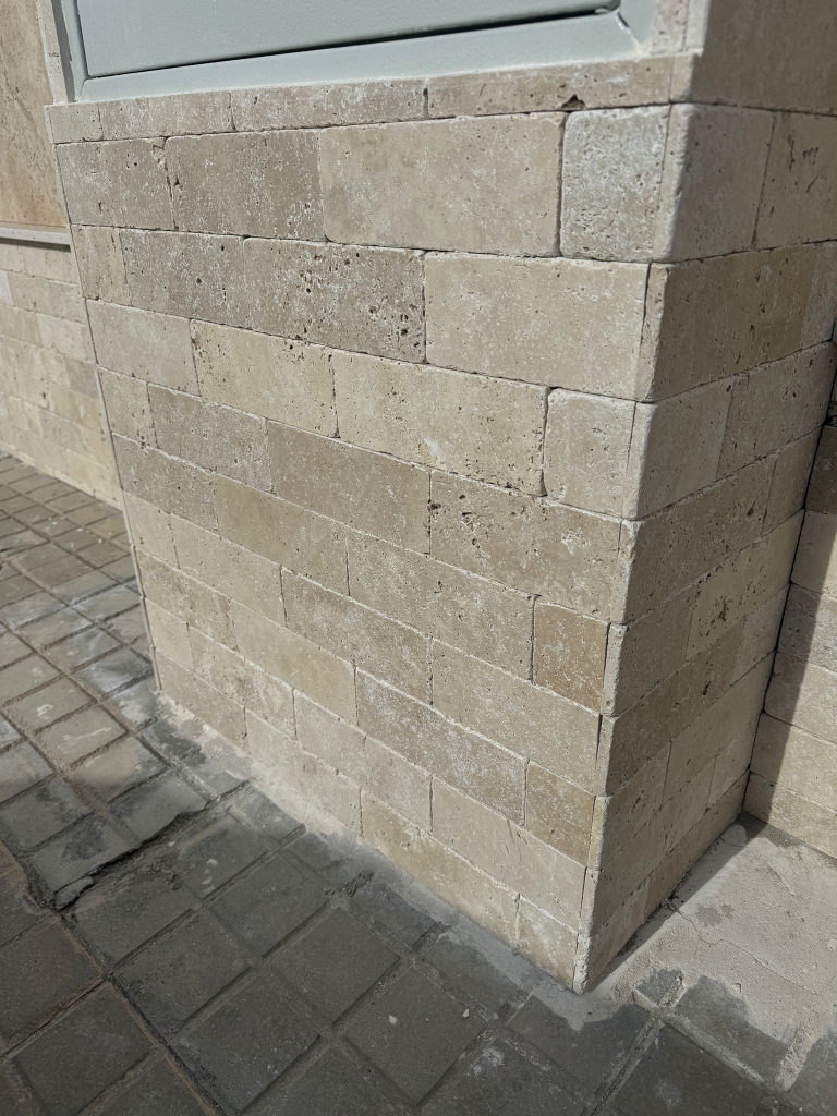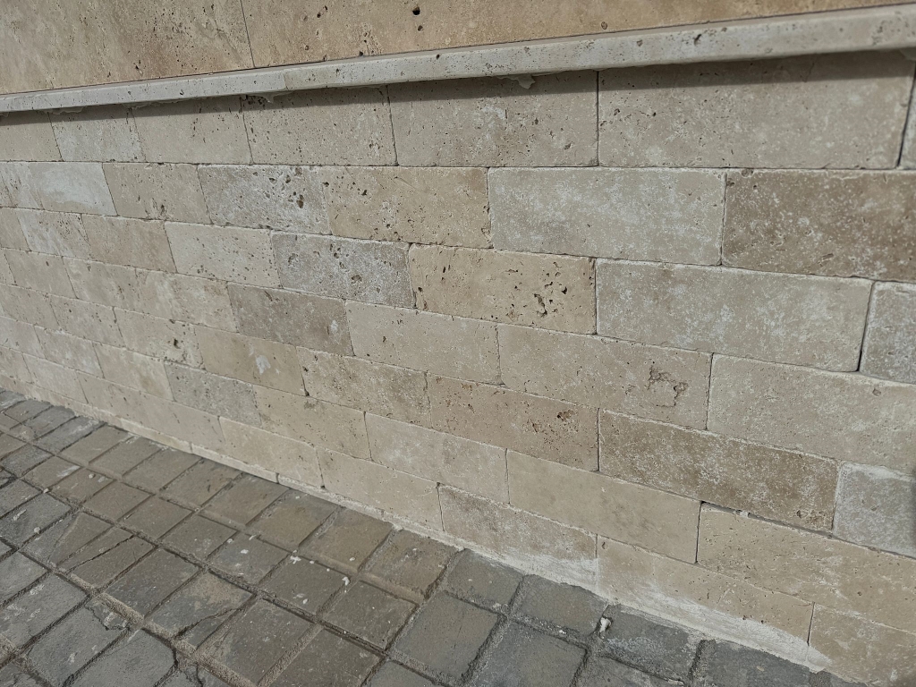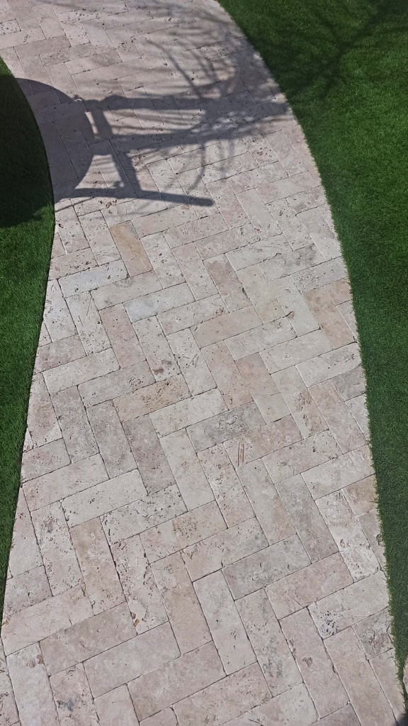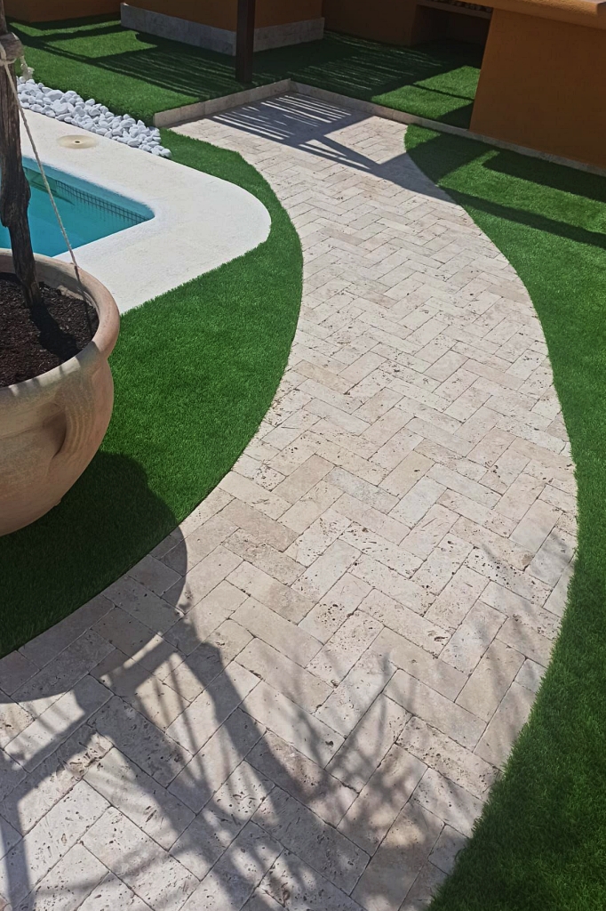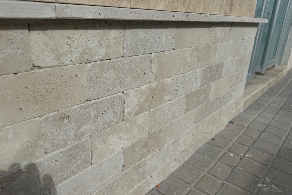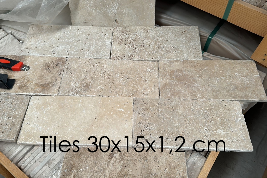 Travertine tiles in size 20x7x1 cm tumbled finish, a fine option for outdoor flooring with its natural charm, suitable for being installed in inspired drawings such as herringbone pattern.